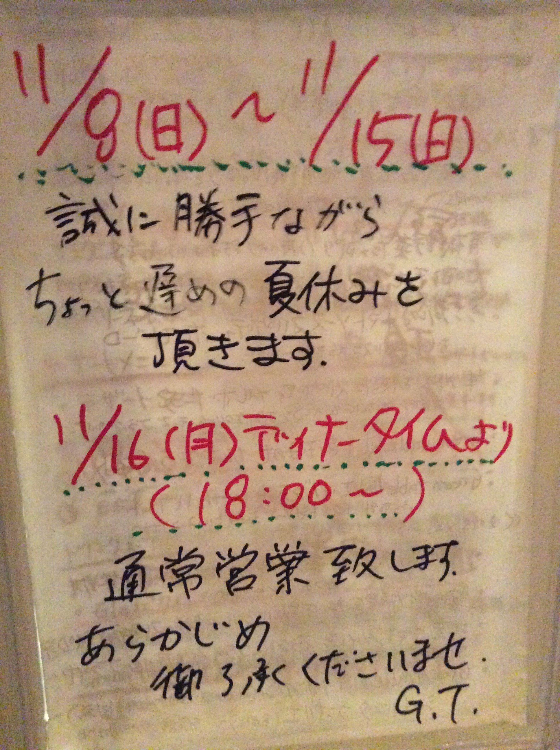 11/8(日)~11/15(日) すんません、 おやすみします。