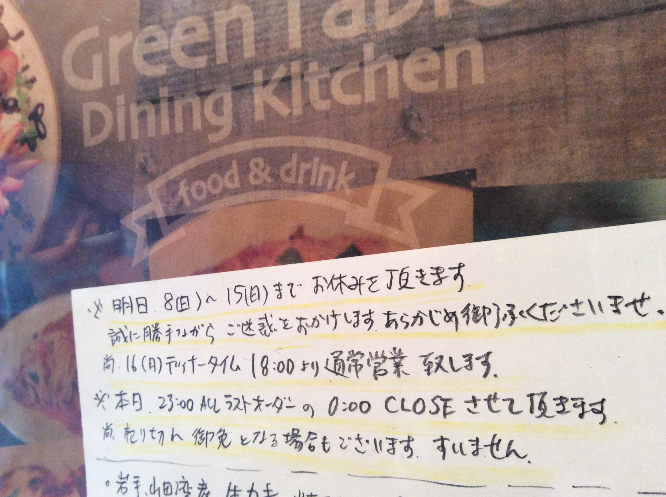 また、本日 7(土) 23:00ラストオーダー(ドリンク共)