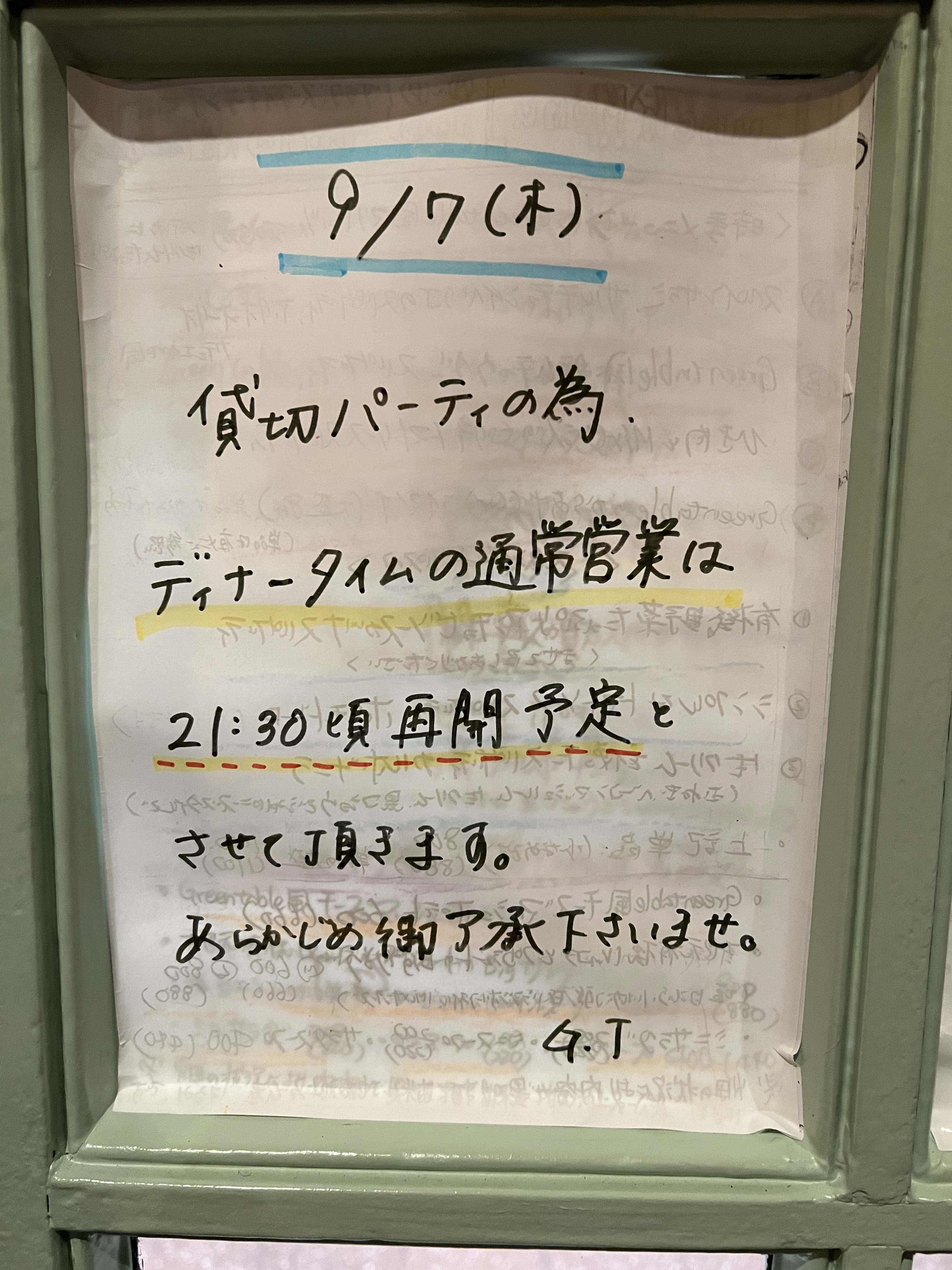 9/7(木)、本日のディナータイムは、